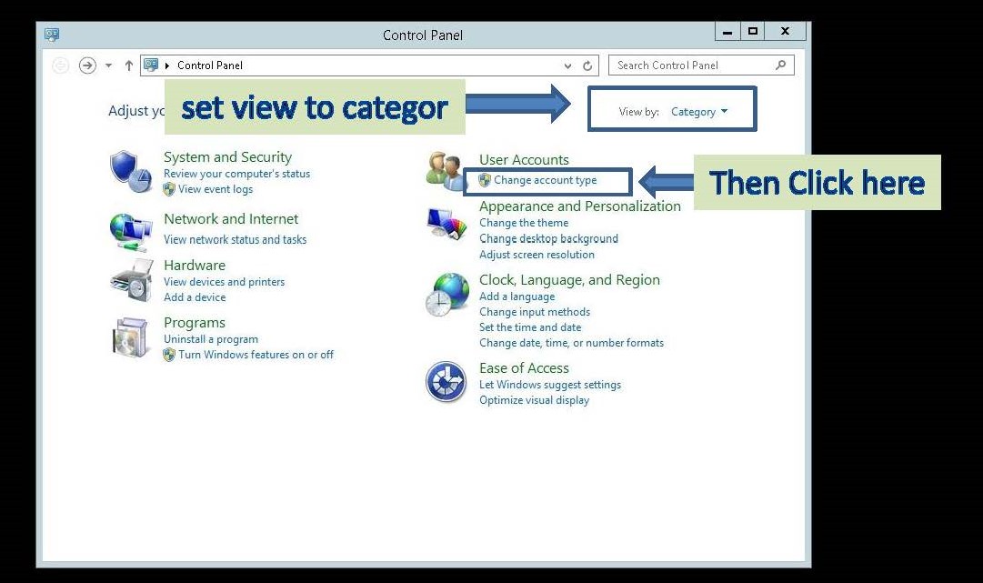 Step 3: Under User Accounts, click on Change account type. Please note, that to see it, you have to change to Category view from the drop-down bar.
